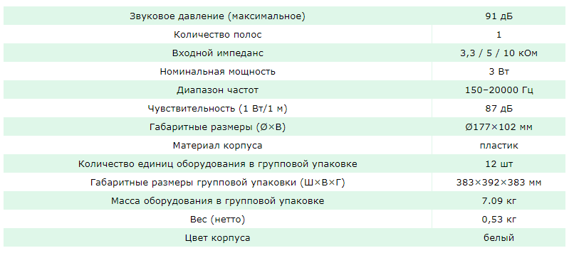 Конструкция устройства рассчитана на внутреннюю установку в подвесных потолках или стеновых панелях внутри помещений. Громкоговоритель фиксируется на монтажной поверхности с помощью двух металлических пружинных клипс, прижимающихся к потолочной или стеновой панели изнутри. Материал декоративной решетки - пластик, цвет декоративной решетки - белый. Возможность работы на линиях напряжением 70 и 100 В
