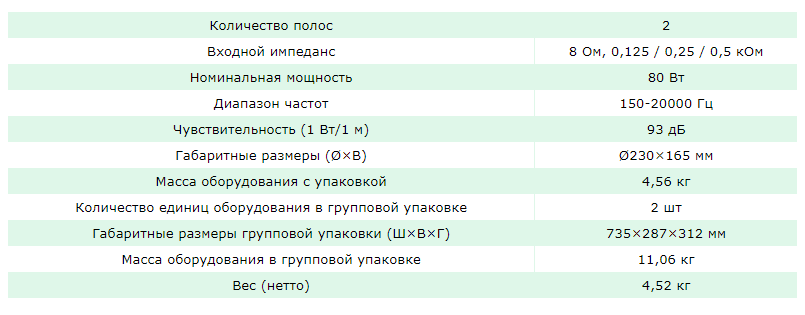 Конструкция устройства рассчитана на внутреннюю установку в подвесных потолках. Громкоговоритель является двухполосным и оснащен 6-дюймовым широкополосным динамическим излучателем, 1-дюймовым твиттером и переключателем сопротивления для установки требуемой подводимой мощности и громкости. Материал декоративной решетки — сталь, цвет корпуса декоративной решетки — белый. Возможность работы на линиях напряжением 70 и 100 В.