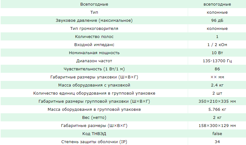 Громкоговоритель колонного типа, 10 Вт, 86 дБ, 135-13700 Гц