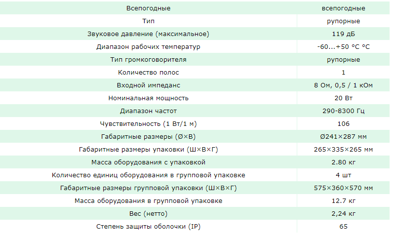 Конструкция громкоговорителя рассчитана на уличную установку, допускается прямое попадание атмосферных осадков. Исполнение: влагозащищенное. Материал - алюминий, цвет корпуса - темно-серый. Инсталляция: поворотный кронштейн входит в комплект поставки и обеспечивает ориентацию громкоговорителя в вертикальной и горизонтальной плоскостях. Возможность работы на линиях напряжением 70 и 100 В.