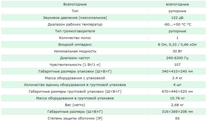 Конструкция громкоговорителя рассчитана на уличную установку, допускается прямое попадание атмосферных осадков. Исполнение: влагозащищенное. Материал - пластик, цвет корпуса - темно-коричневый. Инсталляция: поворотный кронштейн входит в комплект поставки и обеспечивает ориентацию громкоговорителя в вертикальной и горизонтальной плоскостях. Возможность работы на линиях напряжением 70 и 100 В.