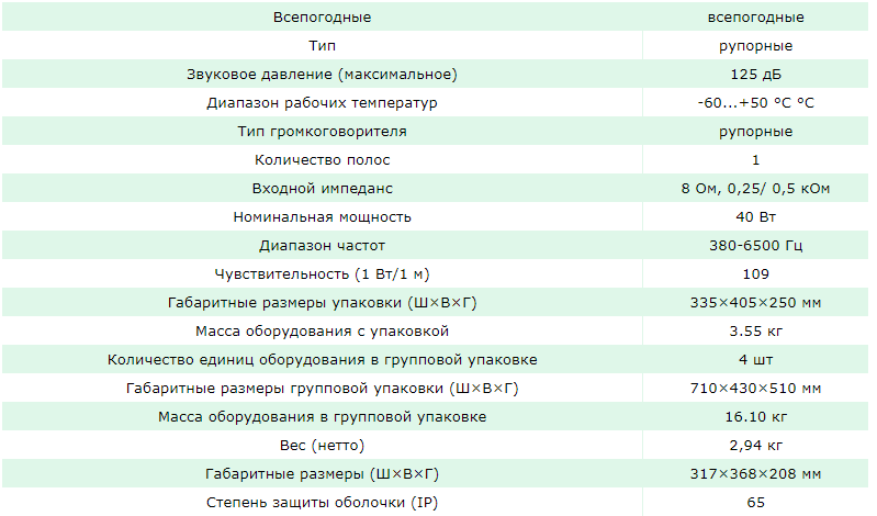 Конструкция громкоговорителя рассчитана на уличную установку, допускается прямое попадание атмосферных осадков. Исполнение: влагозащищенное. Материал - пластик, цвет корпуса - темно-коричневый. Инсталляция: поворотный кронштейн входит в комплект поставки и обеспечивает ориентацию громкоговорителя в вертикальной и горизонтальной плоскостях. Возможность работы на линиях напряжением 70 и 100 В.