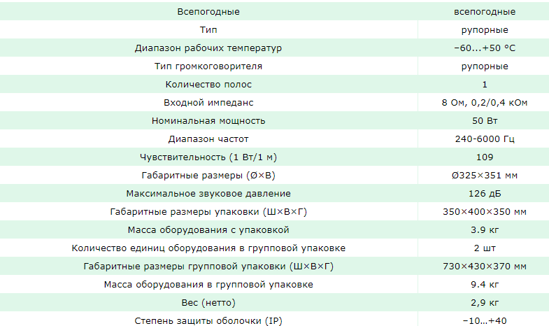 Конструкция громкоговорителя рассчитана на уличную установку, допускается прямое попадание атмосферных осадков. Исполнение: влагозащищенное. Материал - алюминий, цвет корпуса - темно-серый. Инсталляция: поворотный кронштейн входит в комплект поставки и обеспечивает ориентацию громкоговорителя в вертикальной и горизонтальной плоскостях. Возможность работы на линиях напряжением 70 и 100 В.