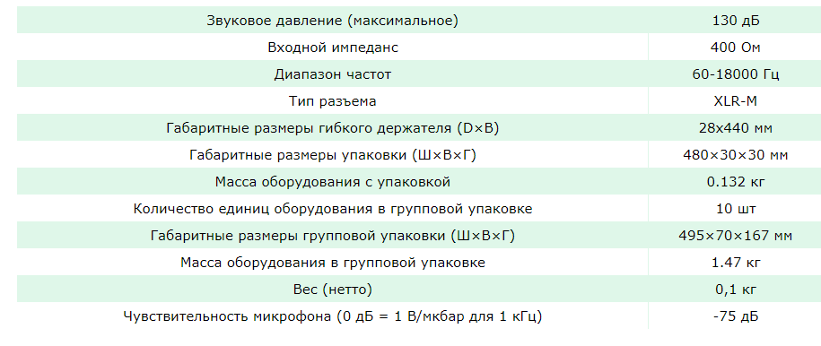 Динамический микрофон на гибком держателе предназначен для подключения к микрофонным панелям RM-01 и RM-02 и служит для преобразования звуковых колебаний в электрические. Устройство имеет динамический преобразователь с кардиоидной диаграммой направленности, разъем типа XLR.
