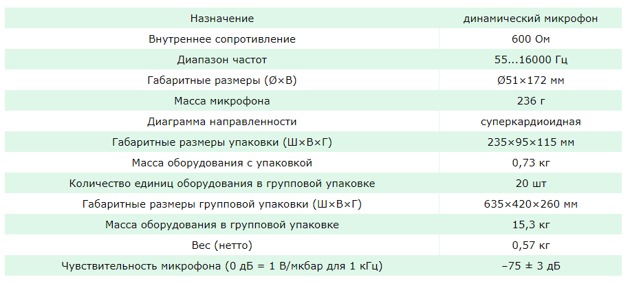 Устройство обладает суперкардиоидной диаграммой направленности, высокой чувствительностью и равномерной амплитудно-частотной характеристикой, имеет в своем составе динамический преобразователь, прочный металлический корпус с разъемом XLR male и ползунковым выключателем. В комплект входит микрофонный корд (XLR male - XLR female, 5 м). Вариант исполнения устройства - ручной.