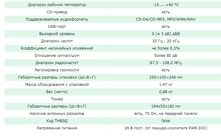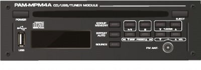 Модуль оснащен CD-проигрывателем на один диск, USB-портом для воспроизведения с подключаемой флеш-карты файлов с расширением MP3/WMA/WAV, а также цифровым FM-тюнером. Антенна, входящая в комплект поставки, подключается к антенному входу на передней панели. PAM-MPM4A позволяет сохранить в энергонезависимой памяти настройки частот вещания для 40 радиостанций, работающих в диапазоне 87,5 - 108,0 МГц. Для отображения режимов работы устройство имеет жидкокристаллический индикатор с подсветкой. Для воспроизведения файлов в устройстве предусмотрены режимы повтора и произвольного порядка.