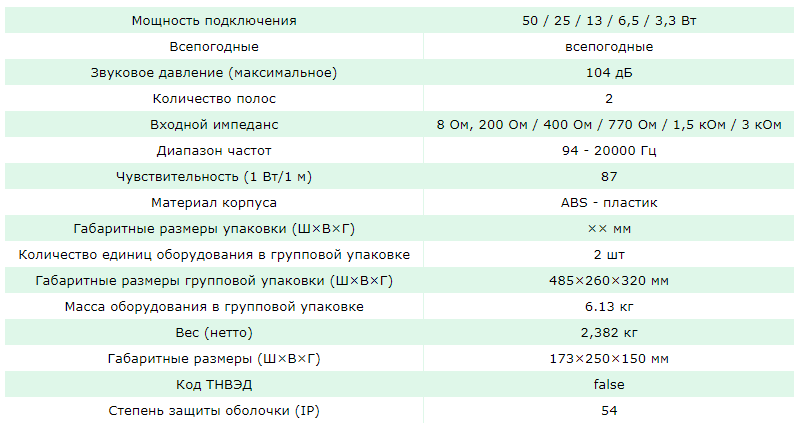Громкоговоритель предназначен для подключения в линию 70 или 100 В, дополнительно имеет возможность подключения к низкоомному выходу усилителя (8 Ом).
